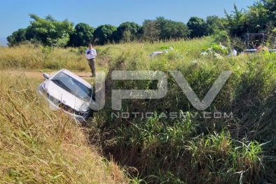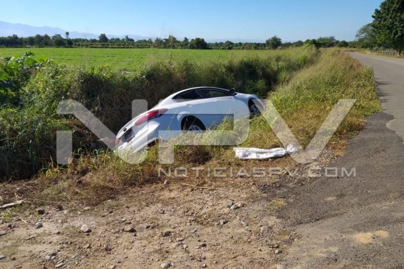 Aparatoso accidente se registró por la carretera del camino viejo, en el tramo de San Juan de Abajo, a Valle de Banderas, donde un auto se salió de la carpeta asfáltica y cayó a una canaleta de riego agrícola, donde afortunadamente no se reportaron personas lesionadas, solo daños materiales.