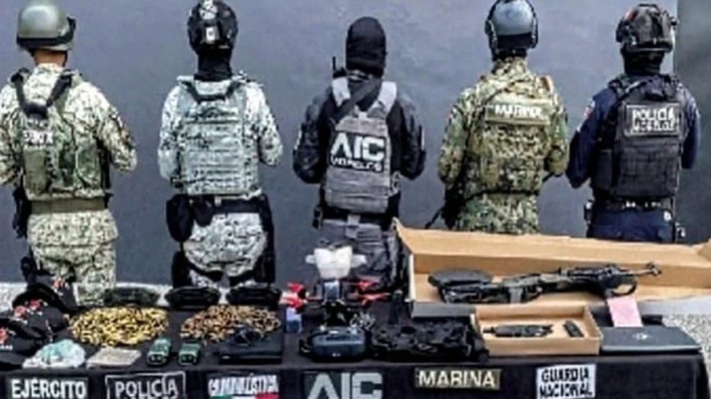 “Ahí se encontraron, como se muestra en las imágenes, un dron modificado, diversas armas de fuego, explosivos, cordón detonante, varios vehículos e identificaciones”, señaló el secretario, quien agregó que el grupo delictivo identificado es rival de la familia de El Indio Cana. También se halló una cartulina con mensajes amenazantes.
