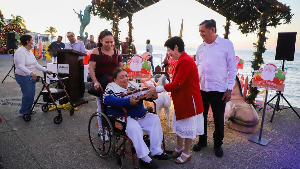 El Profe Michel y la señora Chuyita, arribaron al punto donde se encuentra el nacimiento ubicado sobre el malecón, cargando y meciendo en sus brazos al pequeño Jesús, para luego compartir esta tradición con los vallartenses y visitantes, y dar paso a la conmemoración de la Nochebuena, con la colocación del niño en el pesebre.