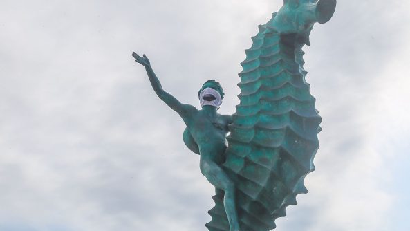 Colocaron la mascarilla al Niño del Caballito de Mar ubicado en el Malecón y en la zona Romántica, así como a la escultura de Neptuno