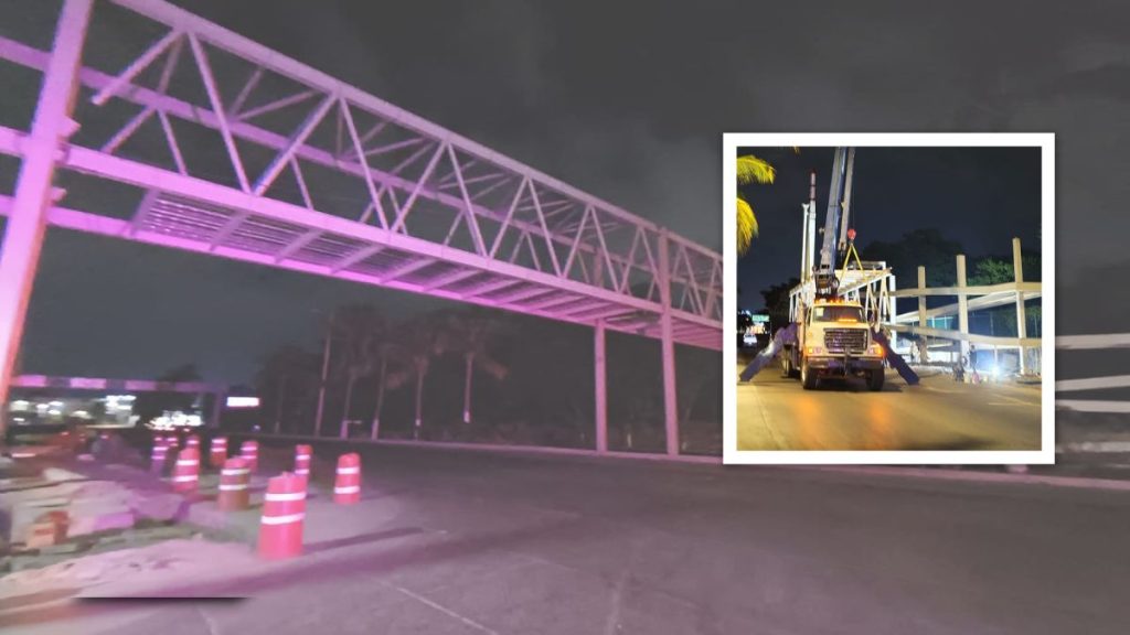 A pesar de los retrasos en su ejecución, la instalación del puente peatonal en el Nodo Vial de Las Juntas presenta avances visibles con la colocación de sus estructuras principales sobre los carriles de la carretera federal 200, uno de los corredores viales más transitados de la región.