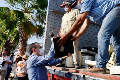 Así lo expresó el presidente municipal de Bahía de Banderas, doctor Jaime Cuevas Tello, quien acompañado de la presidenta del DIF, LTS Ana Esperanza Berumen de Cuevas, asistió a la jornada de acopio del Reciclón 2020, la cual tuvo como sede el estacionamiento del Centro Empresarial Paradise en Nuevo Vallarta, donde se recibieron 8 toneladas de desechos electrónicos de empresas hoteleras, comercios y ciudadanos en general.
