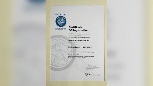 La Presidenta y Directora Ejecutiva del Consejo Mundial de Datos de la Ciudad, Patricia McCartney, notificó al municipio de Bahía de Banderas la Certificación ISO 37122, con lo que se convierte en una de las 10 primeras ciudades a nivel mundial con dicha certificación, la cual establece indicadores orientados a la modernización y automatización de procesos de la ciudad.