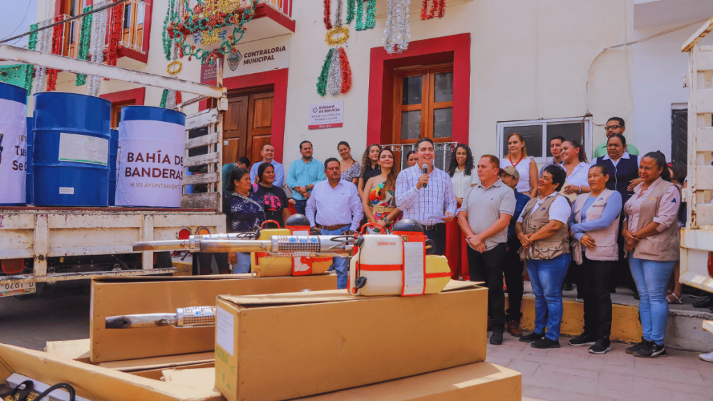 Bahía de Banderas, Nayarit, a 20 de septiembre de 2024.- Como parte de la estrategia para combatir el mosquito transmisor del dengue, zika y chikungunya, este viernes el décimo segundo Ayuntamiento de Bahía de Banderas, encabezado por el alcalde Héctor Javier Santana García, entregó equipo de nebulizadoras y líquido para la fumigación. Estas herramientas serán utilizadas para intensificar los esfuerzos de combate contra los mosquitos en todo el municipio.