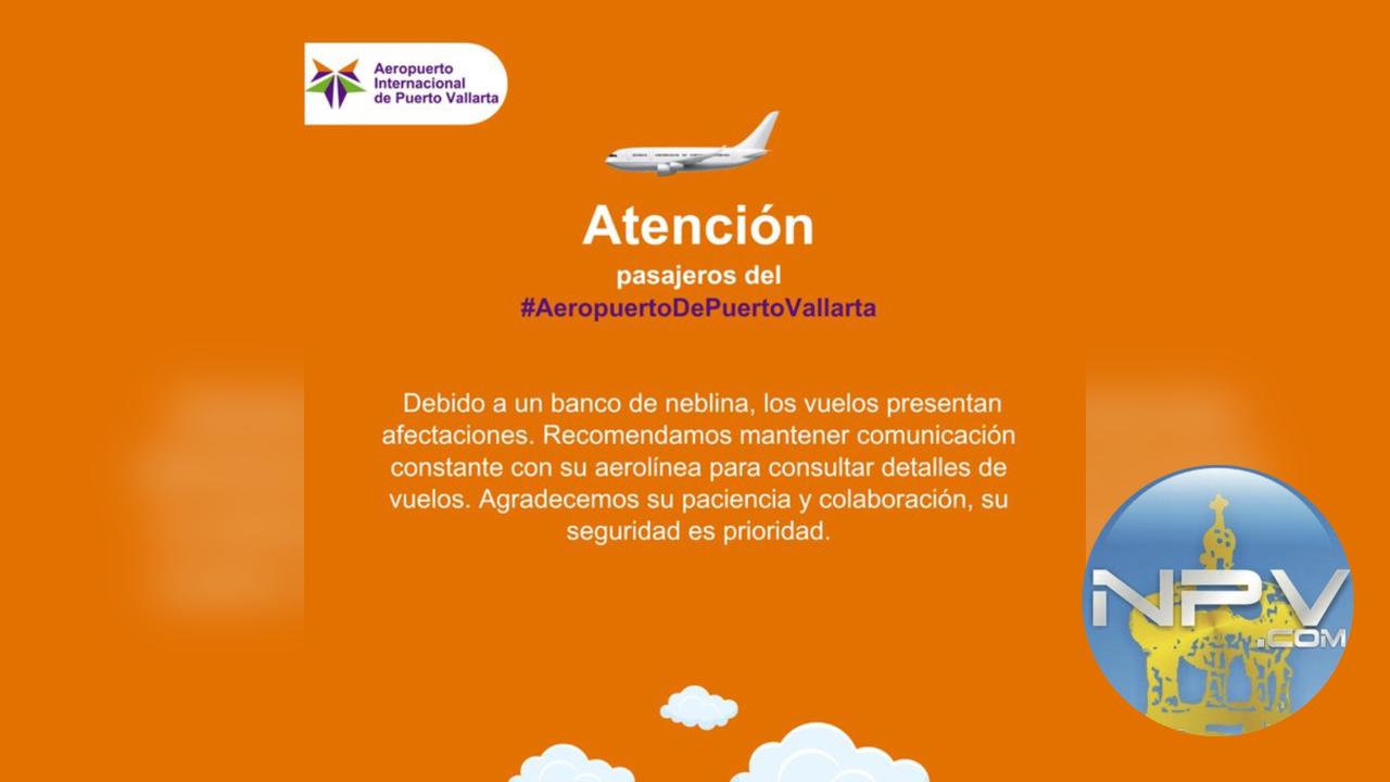 “Atención pasajeros del #AeropuertoDePuertoVallarta: Debido a un banco de neblina, los vuelos presentan afectaciones”, publica la terminal área.
