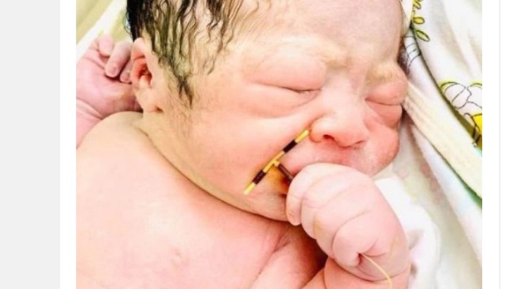 Después de nueve meses de embarazo, la mujer dio a luz, la forma en la que llegó el bebé sorprendió a los médicos y a los padres, quienes decidieron tomar una fotografía del suceso, debido a que el pequeño llevaba el aparato sujeto en una de sus manos.