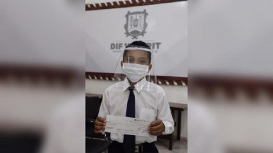 Salvador Antonio Núñez Ayón de 11 años junto con su madre, acudieron a las instalaciones de DIF Nayarit para recibir la décima entrega de la Beca D10, misma que desde que comenzó la administración, la reciben de manera bimestral y está la utilizan para costear gran parte de sus estudios.