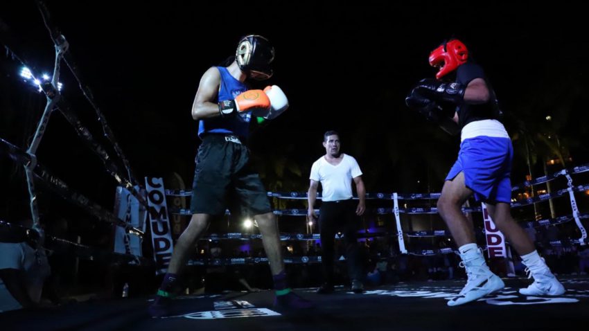 En esta ocasión, una interesante cantidad de personas se dieron cita para colmar las gradas del teatro al aire libre en plena franja turística, para deleite de los aficionados al boxeo y también de los turistas, con una decena de peleas a tres rounds, todas muy emocionantes.