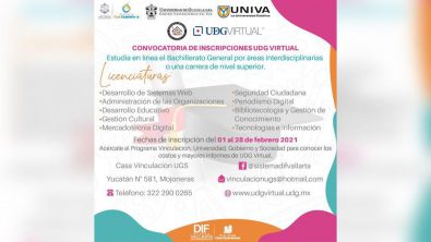 Con el objetivo de seguir impulsando la superación profesional de las personas, el Sistema DIF Municipal que preside la Mtra. Candelaria Tovar de Dávalos, en coordinación con la Universidad de Guadalajara (UdeG), a través del esquema de Vinculación Universidad, Gobierno y Sociedad, en el que participa también la Universidad del Valle de Atemajac (Univa), pide aprovechar este apoyo a quienes deseen continuar con sus estudios de nivel bachillerato o licenciatura, mediante el programa UDG Virtual.