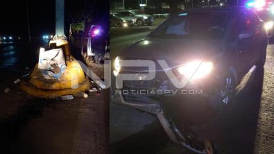 Un auto compacto se quedó sin control y se estrelló con la base del semáforo en pleno boulevard Riviera Nayarit