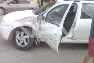 Aparatoso choque se registró en el semáforo del Decameron, donde dos vehículos chocaron entre sí, afectando también una tienda Oxxo, tomando nota los agentes viales, quienes se hicieron cargo del accidente.