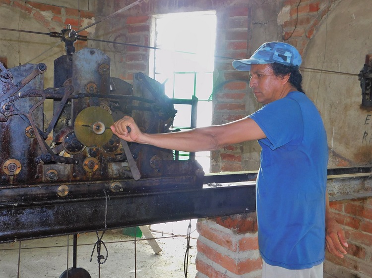 “Hoy les muestro la panza del reloj de nuestra torre, aunque no funciona, no deja de ser una reliquia. En una de las gráficas se aprecia una leyenda que da evidencia que dicha máquina fue inaugurada el 1 de enero de 1970. En la primera gráfica se muestra la escalinata que lleva al piso sobre el reloj cuyas paredes son de un material parecido a la tablaroca y tiene un esqueleto de acero como soporte”.