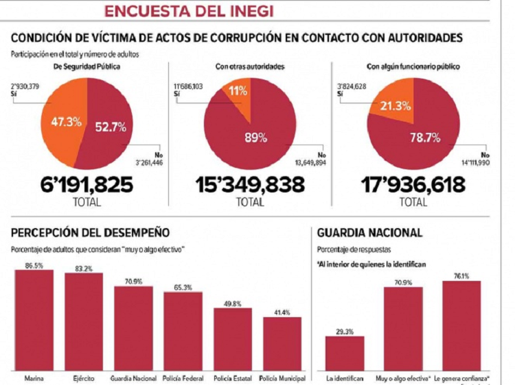 De seis millones 191 mil 825 personas mayores de 18 años que tuvieron contacto con autoridades de seguridad pública durante el primer semestre de 2019, dos millones 930 mil 379 reportaron haber sido víctima de actos de corrupción, reveló por primera vez la Encuesta Nacional de Seguridad Pública Urbana que elabora el Instituto Nacional de Estadística y Geografía (Inegi).
