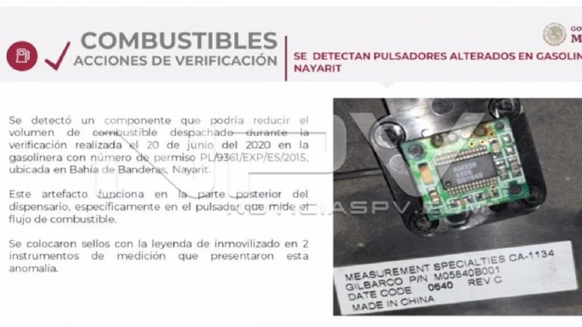 «Se detectó un componente que podría reducir el volumen de combustible despachado durante la verificación realizada el 20 de junio de 20 20 en la gasolinera con número de permiso PL/9361/EXP/ES/2015, ubicada en Bahía de Banderas Nayarit.