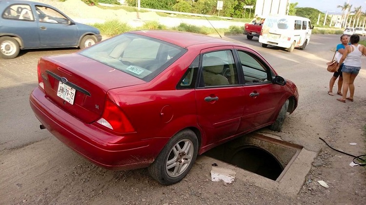 Cae vehículo particular a una alcantarilla y tránsito nunca apareció