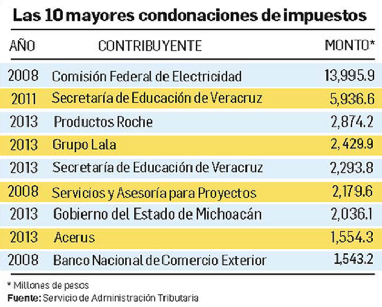 A la CFE se le perdonaron impuestos por 13 mil 995 millones; Bancomext, mil 543 millones; Luz y Fuerza con mil 167 millones de pesos.