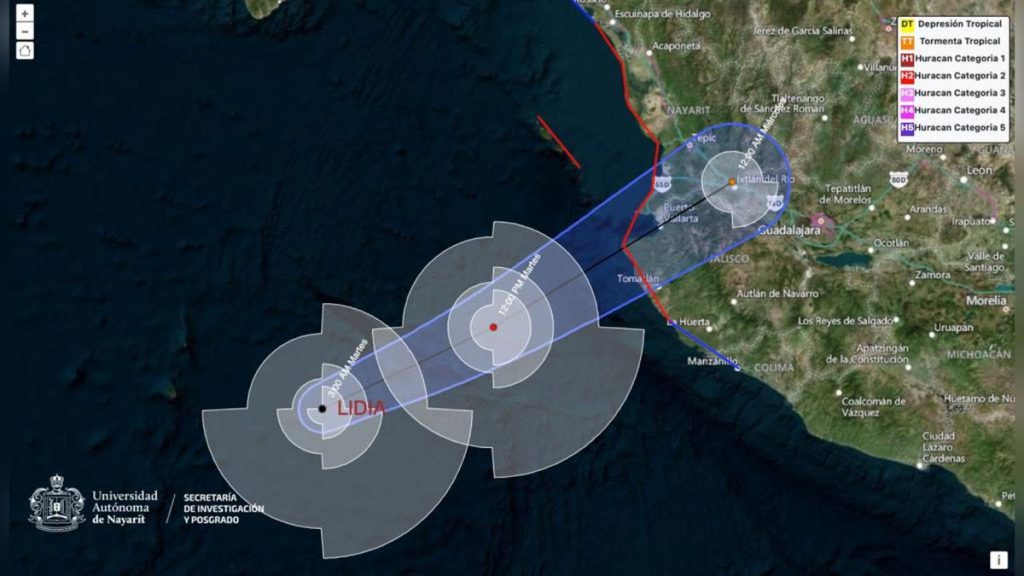 Se estima que durante el medio día de hoy martes, el huracán evolucionará a categoría 2, situándose a 190 km al oeste-suroeste de Cabo Corrientes, Jalisco. Por la tarde-noche, Lidia podría tocar tierra en las inmediaciones entre Jalisco y Nayarit.