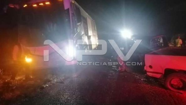 Aparatosa carambola se registró la madrugada de este viernes sobre la carretera federal 200 dentro del municipio de Compostela, en donde se vieron involucrados cuatro vehículos, uno de ellos del transporte público.