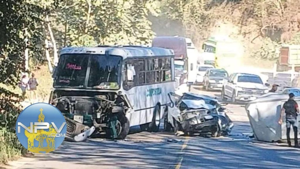 El percance involucró una camioneta de carga, que según los reportes preliminares habría invadido el carril contrario al intentar rebasar, chocando de frente contra un camión de transporte público de Compostela.