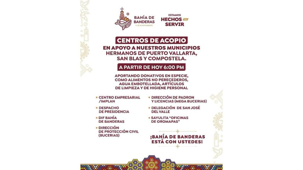 A partir de este domingo 12 de octubre, desde las 18:00 horas, se habilitarán centros de acopio oficiales donde la población podrá entregar sus donativos: Centro Empresarial, Presidencia Municipal, DIF Municipal, Dirección de Padrón y Licencias, Delegación de San José del Valle y oficinas de OROMAPAS.