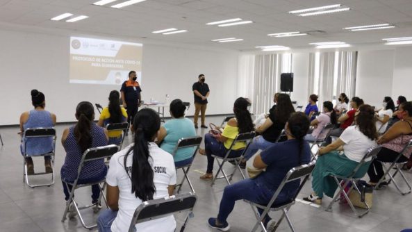 En la charla encabezada por la presidenta del organismo asistencial, acompañada del comandante César Zamora, de Protección Civil y Bomberos de Puerto Vallarta, y el doctor Vladimir Atilano, subdirector de la VIII Región Sanitaria de la SSJ, Candelaria Tovar invitó al personal de los CADI’s a seguir las indicaciones para evitar el posible contagio de menores dentro de los planteles.