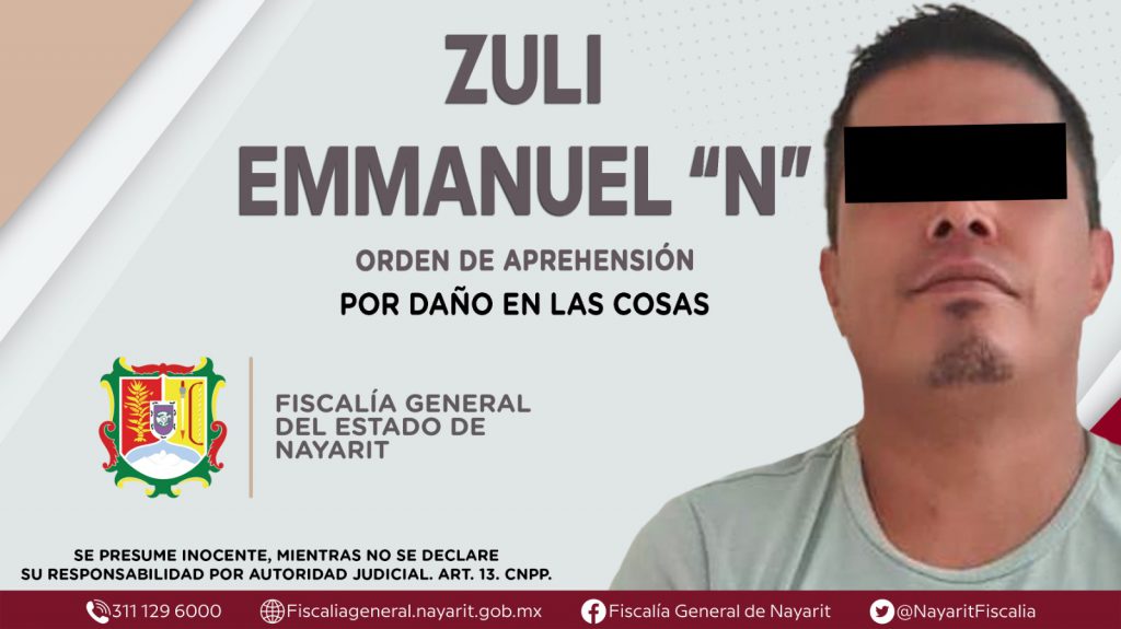 La Agencia de Investigación Criminal de la Fiscalía General del Estado llevó a cabo la captura de Zuli Emmanuel «N» en la localidad de Jarretaderas, municipio de Bahía de Banderas. La detención se realizó en cumplimiento de una orden de aprehensión por su presunta participación en el delito de daño en las cosas, cometido contra una persona de sexo masculino cuya identidad se mantiene reservada.