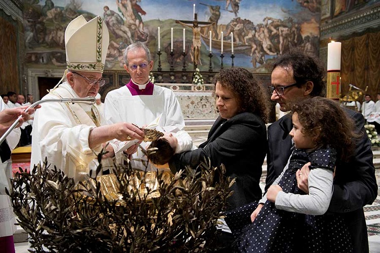 *En una larga ceremonia en la Capilla Sixtina, Francisco impone el sacramento del bautismo a 18 niñas y 16…
