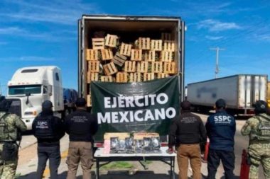 Elementos del Ejército Mexicano, FGR y SSPC, al inspeccionar un tractocamión que transportaba nopales,…
