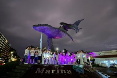 Realizan encendido de la iluminación de la escultura de la ballena de Marina Vallarta, en…