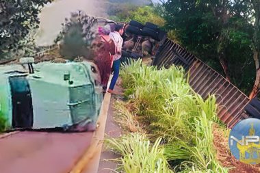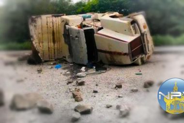 Tráiler cargado de piedra volcó frente a la birriería de Mesillas
