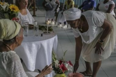 Una docena de personas, sobre todo de mujeres, vestidas de blanco, con turbantes y…
