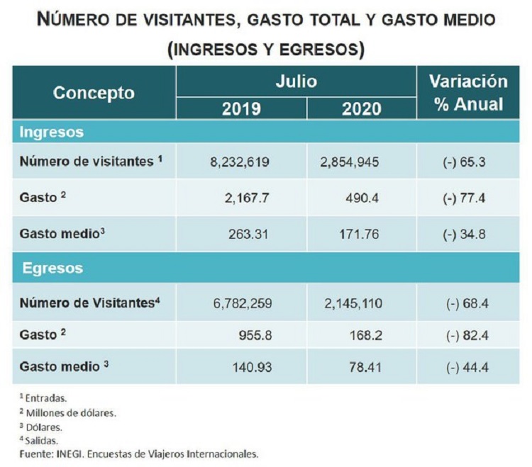 Inegi detalló que en julio el número de visitantes se redujo 65.3 por ciento, respecto a 2019; además el gasto total se redujo 77.4 por ciento y el gasto medio de cada turista lo hizo 34.8 por ciento.
