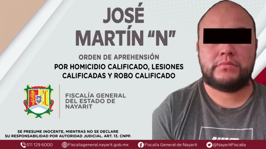 Comunicado.- En Ciudad Juárez, Chihuahua y con la colaboración de la Fiscalía General de esa entidad, elementos de la Agencia de Investigación Criminal de Nayarit dieron cumplimiento a una orden de aprehensión que se obsequió contra José Martín “N”, por su probable participación en hechos que la ley califica como delitos de homicidio calificado, lesiones calificadas y robo calificado; el primer delito fue cometido en agravio de dos personas de sexo masculino, el segundo ilícito se cometió contra una persona de sexo masculino, en tanto el tercer delito fue en agravio del Ayuntamiento de Bahía de Banderas.