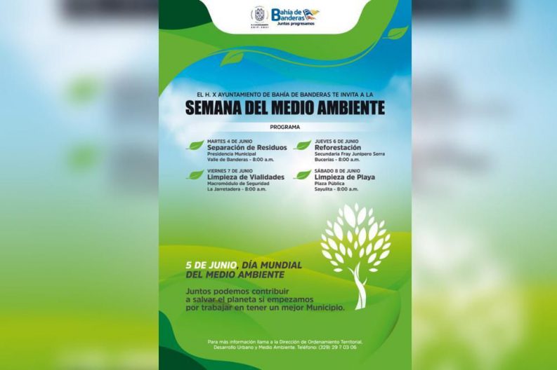 A través de diversas actividades públicas, del 4 al 7 de Junio, el Gobierno Municipal de Bahía de Banderas que encabeza el doctor Jaime Cuevas Tello, realizará los festejos del Día Mundial del Medio Ambiente, con el objetivo de sembrar la semilla de concientización, sobre el cuidado y responsabilidad que tenemos todos con la naturaleza.