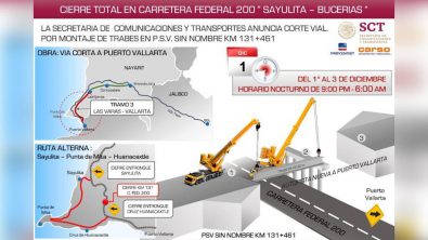 Los próximos martes 1, miércoles 2 y jueves 3 de diciembre se cerrará el tramo de la carretera federal 200, de Sayulita a la Cruz de Huanacaxtle de las 21:30 a las 06:00 horas en horario del pacífico, es decir, de las 10:30 de la noche a las 07:00 de la mañana en horario del centro (Puerto Vallarta y Bahía de Banderas), debido a los trabajos de colocación de trabes de la Autopista Jala-Puerto Vallarta, por parte de las constructoras CARSO y Freyssinet.
