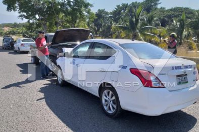 Asegura el conductor de la camioneta, que de repente pierde el control del volante, debido a una falla mecánica, invadiendo por completo el carril contrario al ir circulando por el puente de ingreso a Jarretaderas, impactándose de frente contra un vehículo Nissan, tipo Versa, de color blanco, del sitio de Bucerías, con número económico NBB-0045, que era conducido por Adrián López, con domicilio en la colonia las Parotas, el cual resultó con golpes en el rostro al pegar en el vidrio, pero afortunadamente no ponen en riesgo su vida.