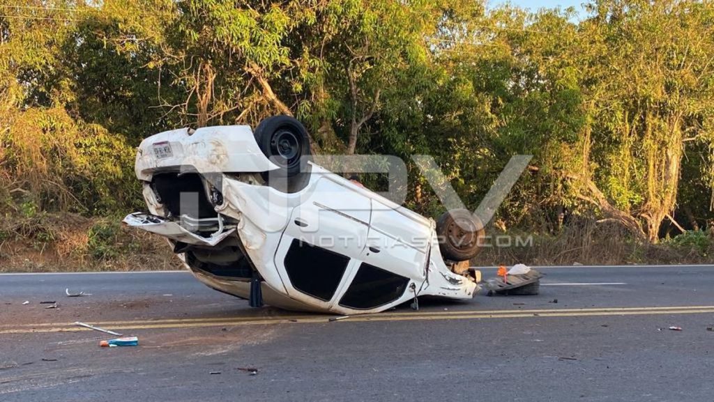 Fuerte accidente se registró sobre la carretera federal 200, entre los poblados de puerto de La Lima y el crucero de Altavista, en donde un auto compacto que se quedó sin control, se estampó contra el paredón y terminó volcado.