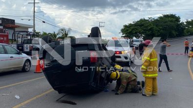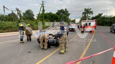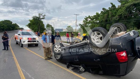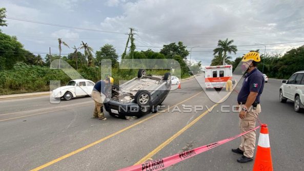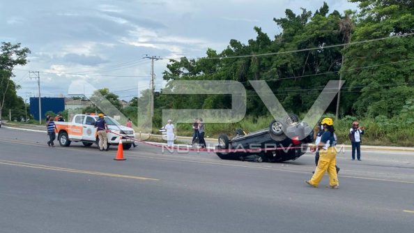 Aparatoso choque y volcadura se registró la tarde de este domingo sobre la venida de ingreso hacia Nuevo Vallarta, cerca de la glorieta de “El Tigre”, en donde un auto compacto golpeó a una camioneta familiar, la cual terminó volcada.