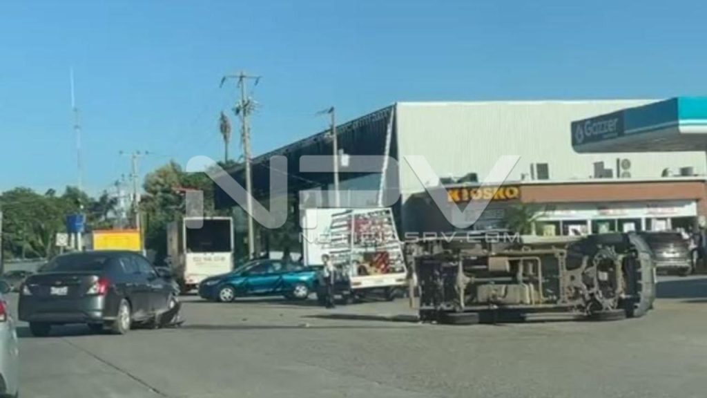 Un accidente vial entre un vehículo compacto y una camioneta provocó la volcadura de esta última la mañana de este miércoles, sobre la carretera que conecta Puerto Vallarta con Bahía de Banderas, a la altura de la gasolinera cercana a la base de la Guardia Nacional.
