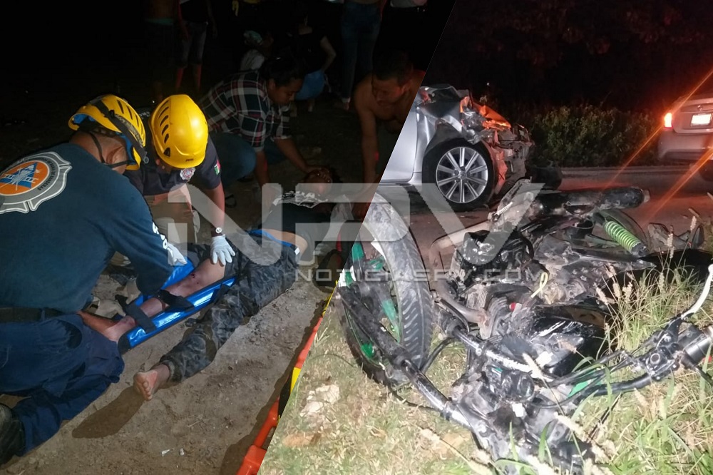 Aparatoso accidente se registró la madrugada de este sábado, sobre el camino viejo a Valle de Banderas, en Bahía de Banderas, en donde se vieron involucrados una moto y un auto compacto, resultando dos personas lesionadas.