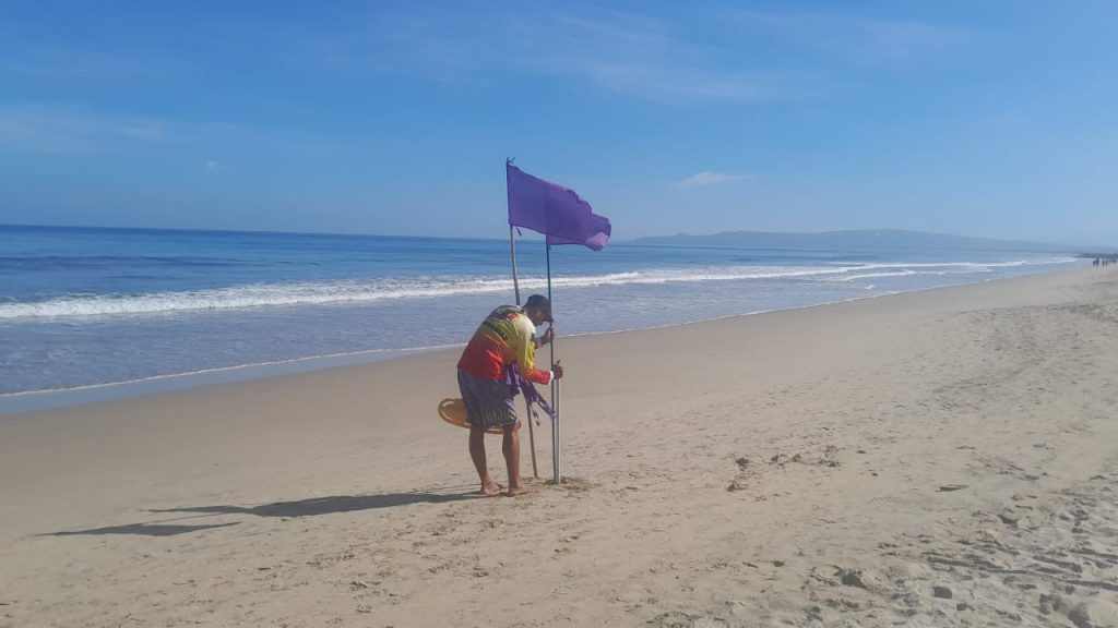 Comunicado.- Se informa que se encuentra colocada la bandera morada en la playa Rincón de Guayabitos, del municipio de Compostela, misma que indica el riesgo al realizar actividades acuáticas por la presencia de la fauna marina nociva “cocodrilo” en aguas no profundas del mar.