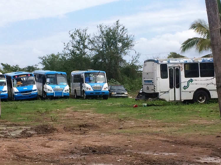 Camino a la zona de las ramadas en Boca de Tomates, se aprecia del lado derecho un vasto terreno en donde están ubicadas más de 20 unidades de lo que fue el servicio de transporte urbano de los azules.