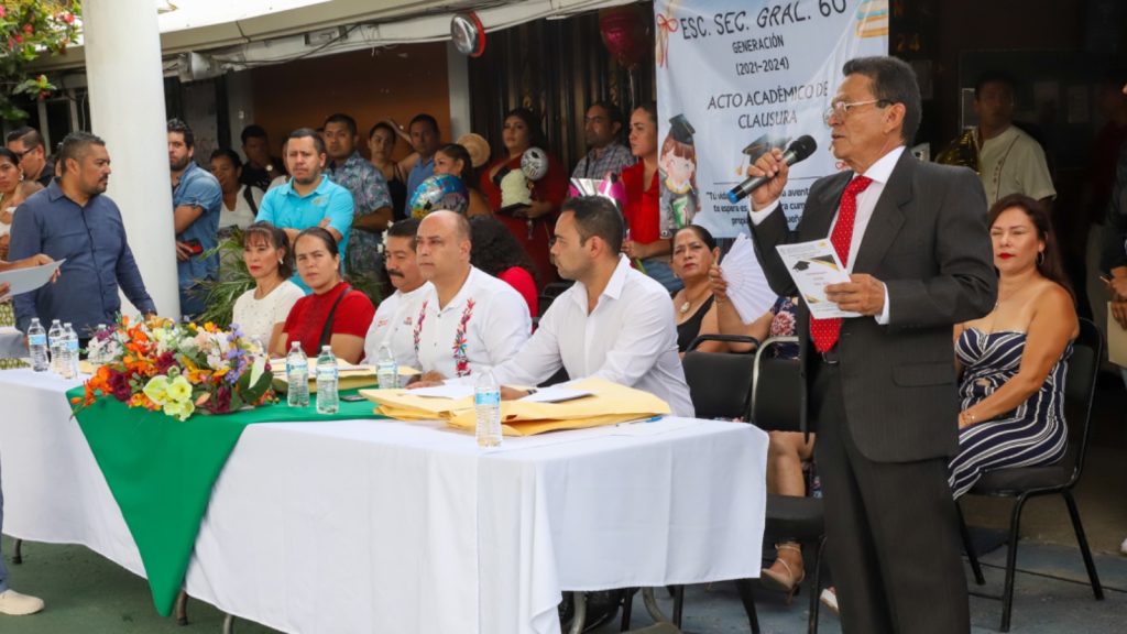 El alcalde interino Francisco José Martínez Gil, encabezó este martes, junto a directivos, autoridades educativas, maestros y padres de familia, el acto académico de clausura de la generación 2021-2024 de la Escuela Secundaria General No. 60, del fraccionamiento La Aurora, donde alumnos de los turnos matutino y vespertino, culminaron sus estudios de educación básica.