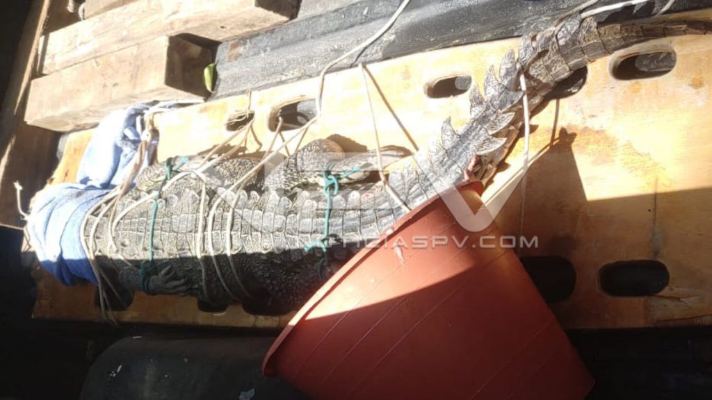 Personal de Protección Ciudadana y Bomberos, con sede en la base regional de Nuevo Nayarit acudieron al lugar señalado, donde autoridades municipales tuvieran capturado a un cocodrilo de aproximadamente 1.62 metros de largo.