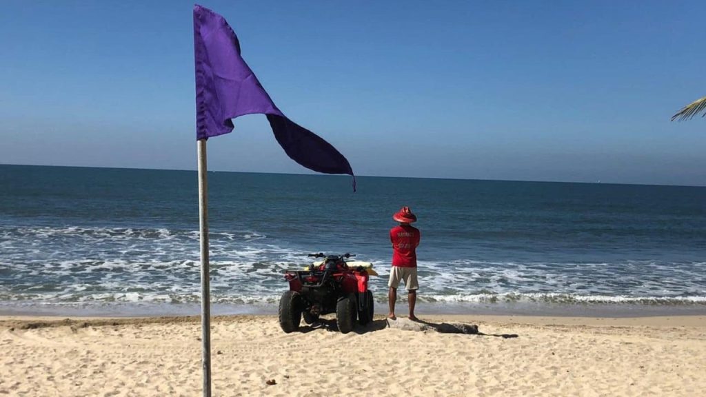 Indica que puede ingresar al mar extremando precauciones. Playas de Guayabitos tiene bandera morada por contar con Fragata Portuguesa