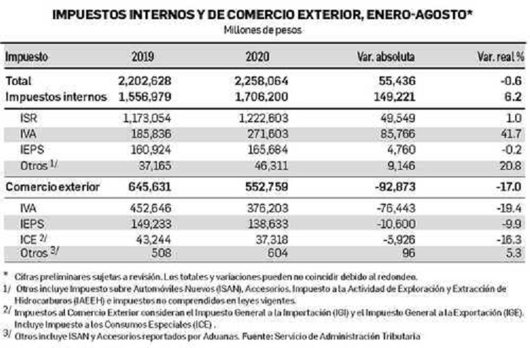 Informes del organismo revelan que la caída fue de 92 mil 872 millones de pesos, al descender de un monto recaudado de 645 mil 631 millones entre enero y agosto de 2019 a 552 mil 759 millones de pesos en el mismo lapso de este año.