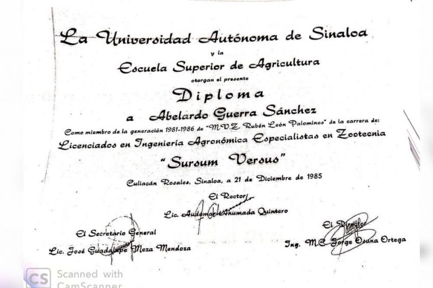 Ostenta, Abelardo Guerra Sánchez, un diploma que supuestamente emite la Universidad Autónoma de Sinaloa y la Escuela Superior de Agricultura que lo acredita como miembro de la generación 81/86 de la carrera de Licenciado en Ingeniería Agronómica Especialistas en Zootecnia con fecha 21 de diciembre 1985.