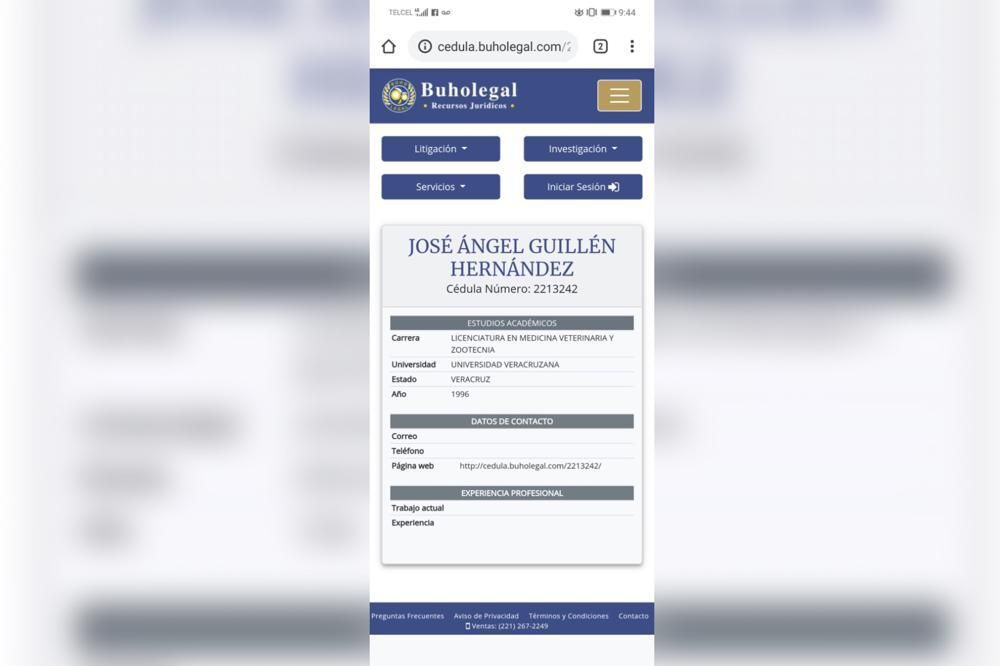 Es la cédula profesional 2213242 que ostenta Abelardo Guerra Sánchez como Médico Veterinario Zootecnista, pero es de otra persona de nombre José Ángel Guillen Hernández. En el rastro municipal de Bahía de Banderas, Nayarit se ostenta como tal y es el inspector sanitario, según documentación que entregó Transparencia su título es falso