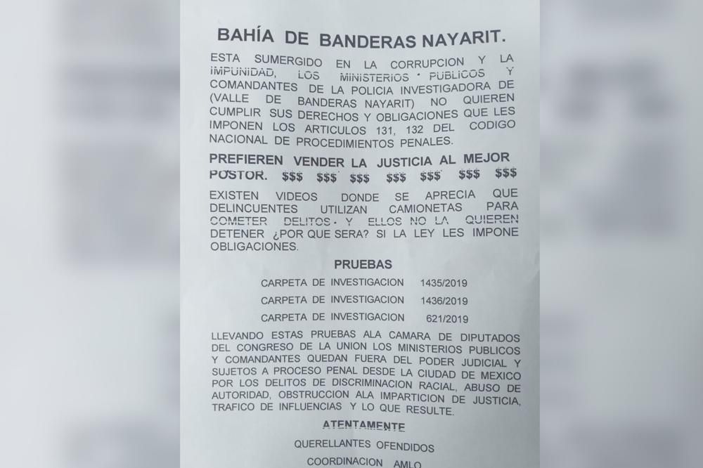 Este viernes 14 de junio 2019, una persona distribuyó, fuera del Ministerio Público de Valle de Banderas, Bahía de Banderas, Nayarit, una hoja donde denuncia corrupción en esta agencia del Ministerio Público que incluye a agentes y la policía investigadora de la Fiscalía General de Nayarit y da cuenta de números de expedientes.