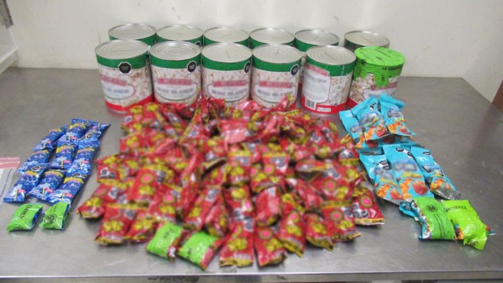 Tras una revisión realizada por agentes especializados en la detección de narcóticos, se localizaron 110 paquetes de dulces que contenían metanfetaminas cristalizadas, con un peso total de 6 kilos, además de 12 latas que contenían alrededor de 40 kilos de metanfetamina líquida.
